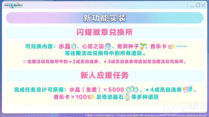 - 玩家通过每日登录、演出等方式获取徽章,兑换稀有道具(如水晶、心愿之露等)。