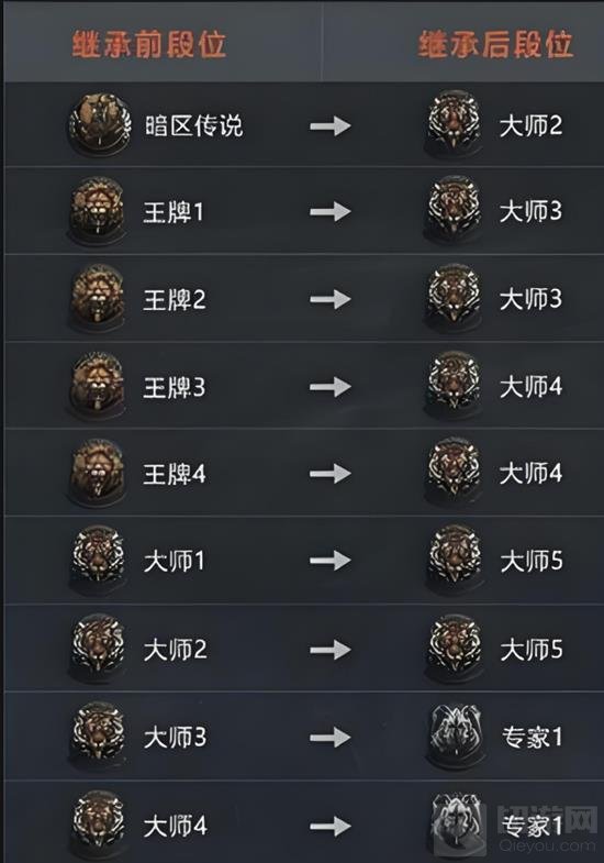 段位继承:玩家在上赛季的段位会下降2个小段位,并以此作为新赛季的起始段位。具体的继承规则是: