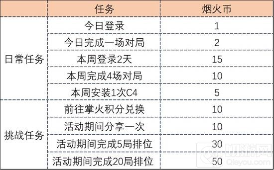 至于日常任务以及挑战任务具体的任务详情以及获取的烟火币数量,各位玩家可以参考以下表格。总的来说,满活跃的情况下,每周一共可以获得51枚烟火币。而挑战任务为一次性任务,一共可以获得220~350枚烟火币。各位玩家可以结合自身的实际情况合理安排任务规划,尽可能收集更多的烟火币。