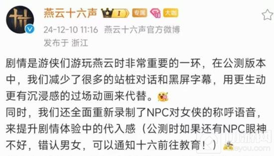 我们可以看见,官方特意表示了测时如果还有NPC眼神不好,错认男女,可以通知十六前往教育这句话,说明游戏中可能还会存在以上的几种bug。如果玩家们遇见了,可以反馈给官方。这也可见官方对这款游戏的运营还是十分重视的。