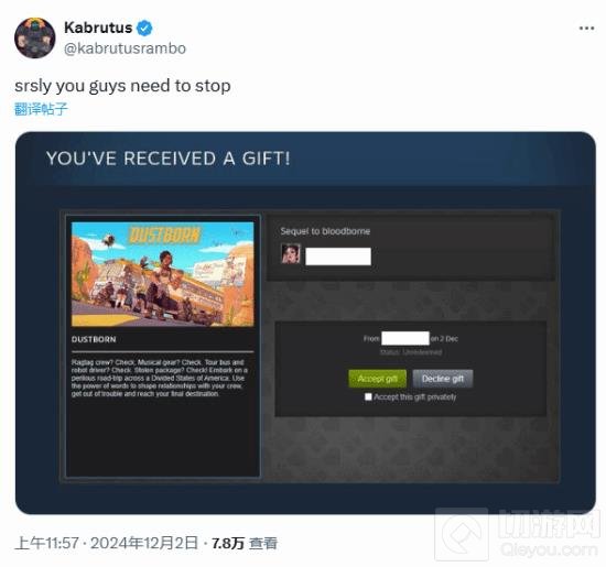 推主 kabrutusrambo,他创办了DEI游戏监测网站,也收到了一份《尘路之旅》的Steam礼物,赠送者错误地声称这是《血源》的续作,这让 kabrutusrambo感到哭笑不得,并呼吁停止这种行为。