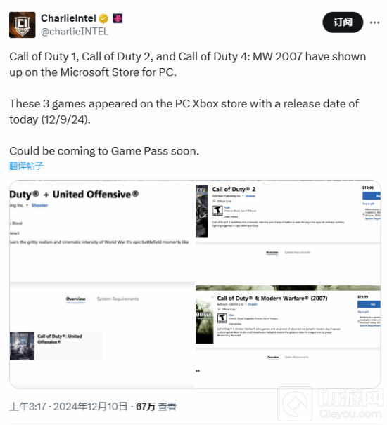 comicbook引述推主@CharlieIntel的推文消息称,《使命召唤1》、《使命召唤2》以及《使命召唤4:现代战争》这三款游戏已经出现在PC平台的微软商城中。虽然玩家已经可以通过多种途径在PC上体验这些游戏,但它们此前并未在微软商城上架,这可能预示着微软计划将这些游戏纳入Xbox Game Pass的阵容。