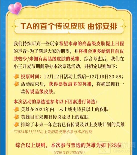 活动内容:票选您希望获得首个传说皮肤的英雄。