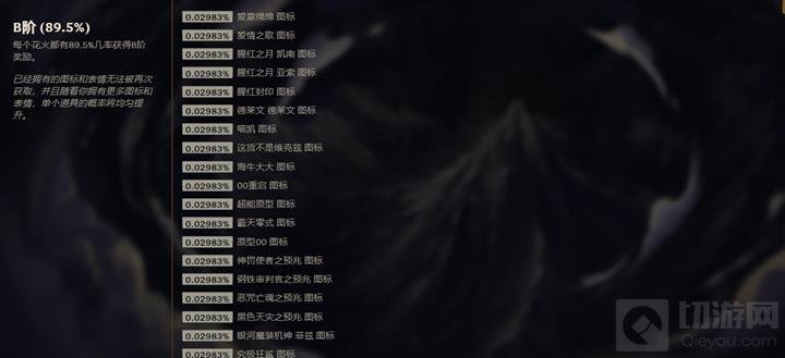 B阶奖励为圣堂花火系统的最常见奖励,主要内容为表情、图标和不同数量的神话精粹: