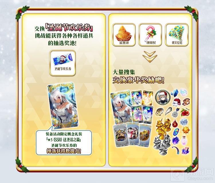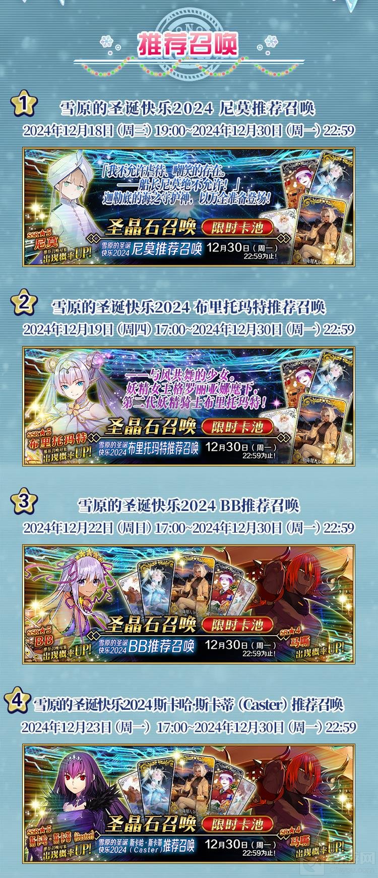 圣诞主题召唤池:期间内开放多个与圣诞节相关的限定召唤池,包括尼莫、布里托玛特、BB、cba在内的多位人气从者将以更高概率出现。