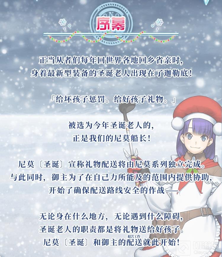 在每年这个时候,从者们都会回到世界各地与家人团聚。然而,今年的迦勒底迎来了一位特别的访客——身着最新型装备的圣诞老人尼莫[圣诞]!这位特殊的圣诞老人将为御主和从者们带来别样的节日惊喜。