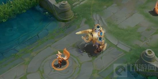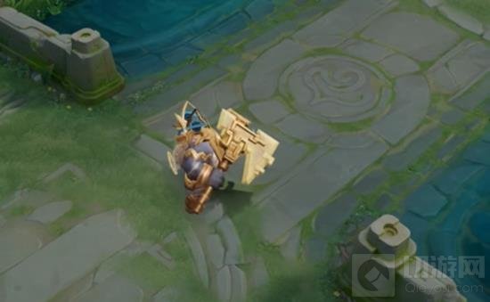 二技能:手持金色能量巨盾冲破阻碍,速度之快产生能量气流,地面产生裂痕。
