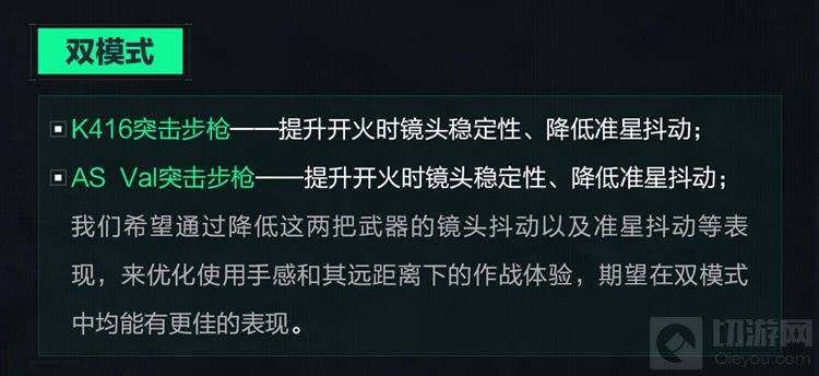 我们希望通过降低这两把武器的镜头抖动以及准星抖动等表现,来优化使用手感和远距离下的作战体验,期望在双模式中均有更好的表现。