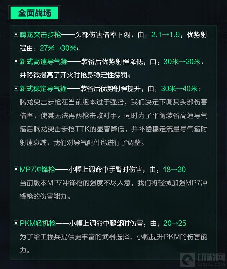 MP7冲锋枪:小幅上调命中手臂时伤害,由18→20。当前版本MP7冲锋枪的强度不尽人意,我们将轻微加强MP7冲锋枪的伤害能力。