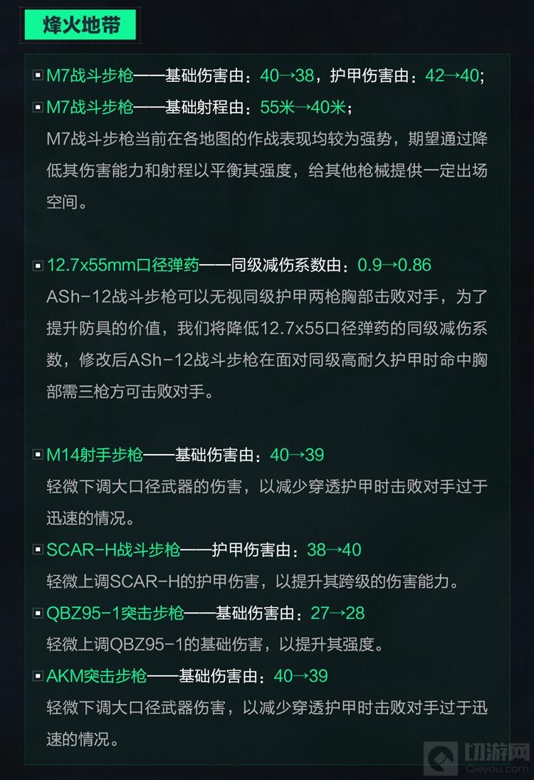 AKM突击步枪:基础伤害由40→39。轻微下调大口径武器伤害,以减少穿透护甲时击败对手过于迅速的情况。