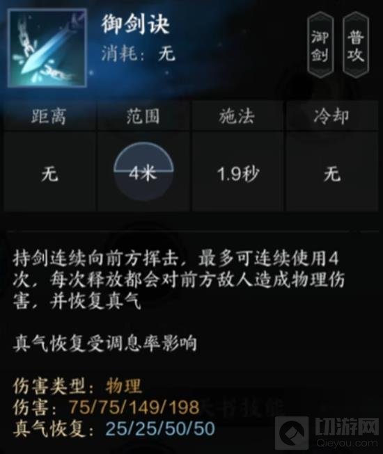 核心技能,造成物理伤害并向前位移,释放除御剑诀外的其他御剑技能会刷新贯虹的冷却时间。