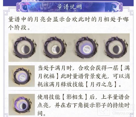 当处于满月时,量谱背景会发光,表示合欢获得了一层满月祝福,此时可以消耗该满月释放技能【月刃之息】。
