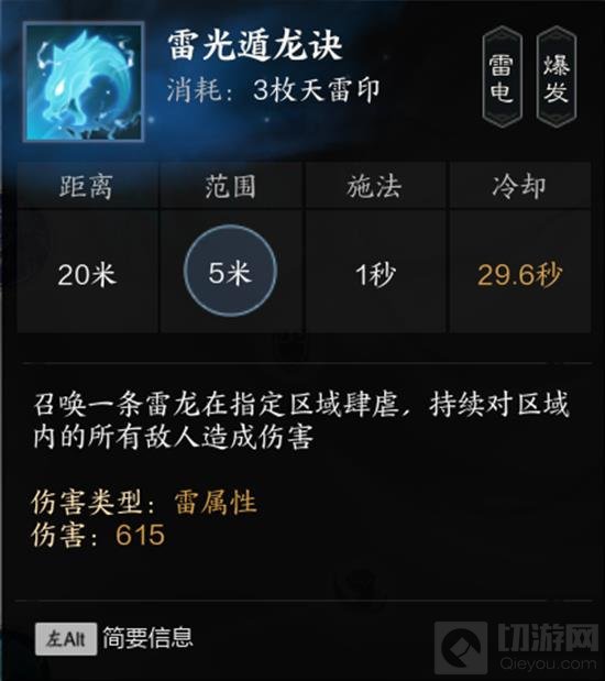 下路分支终极技能雷光遁龙诀,消耗3枚天雷印,在目标位置造成持续8s的大量AOE伤害,冷却时间30s。