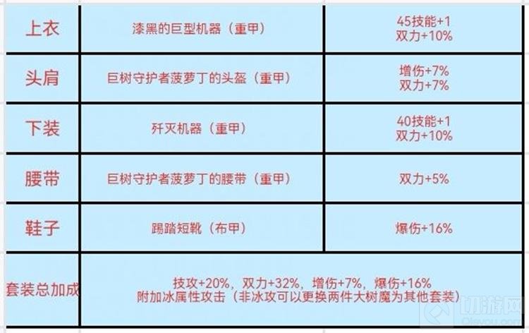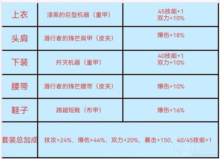 适合狂战士、大枪等职业。属性全面,面板高,自带属性攻击。爆伤流可替换两件暴击套,提升暴击率。