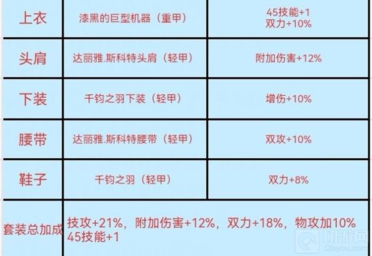 适合剑魂、武神等职业。面板高,附加伤害和增伤效果显著。四件轻甲,本命加成高。