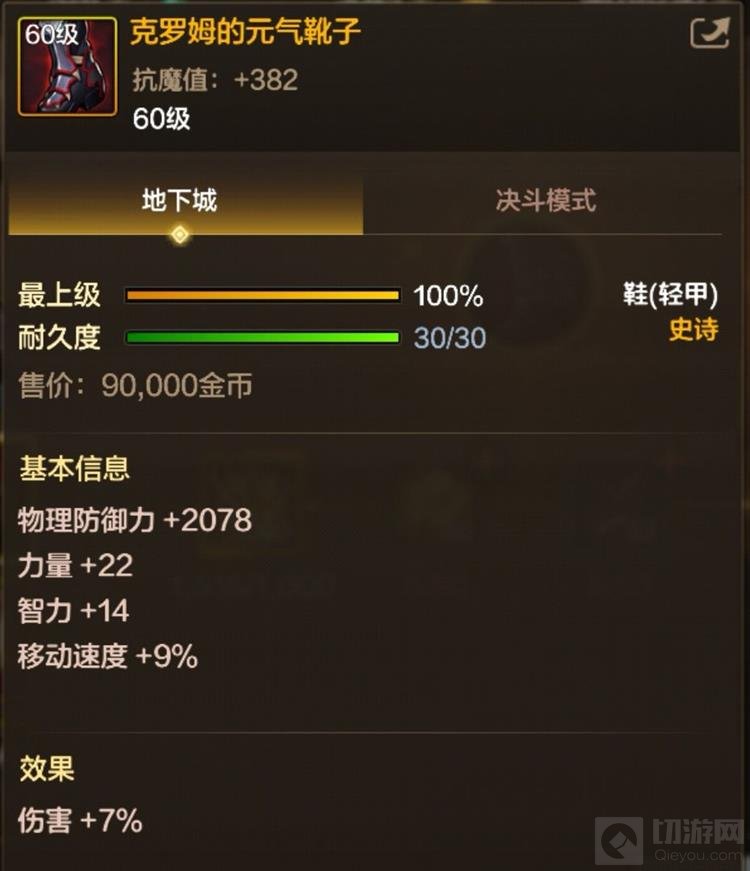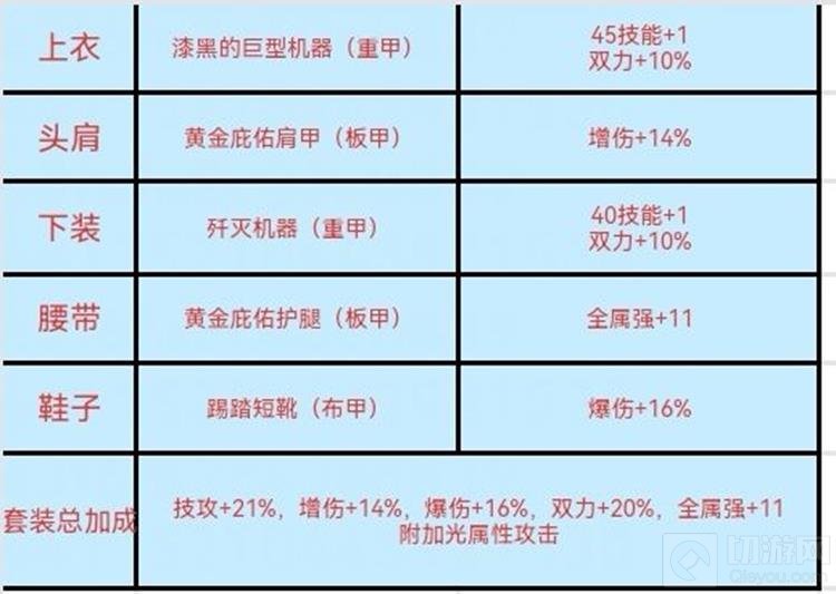 适合鬼泣、元素、气功等职业。伤害附加,双力增加,爆伤增加。若增伤不足,可更换鞋子为轻甲。