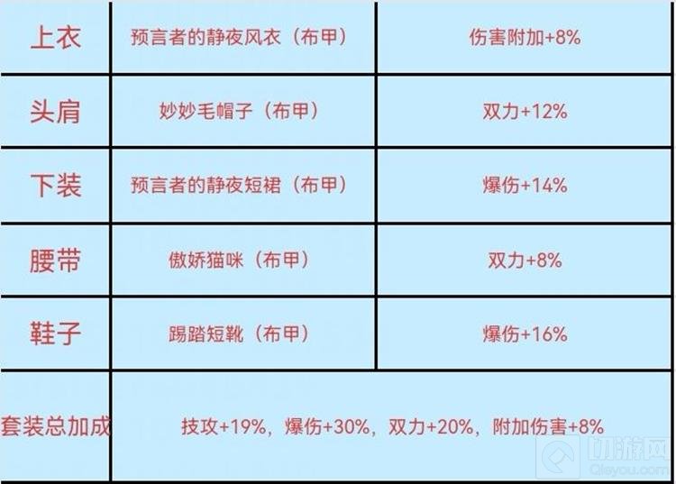 适合魔道、漫游等职业。爆伤高,自带暴击附加。若基础双力低,可替换鞋子以增加双力。