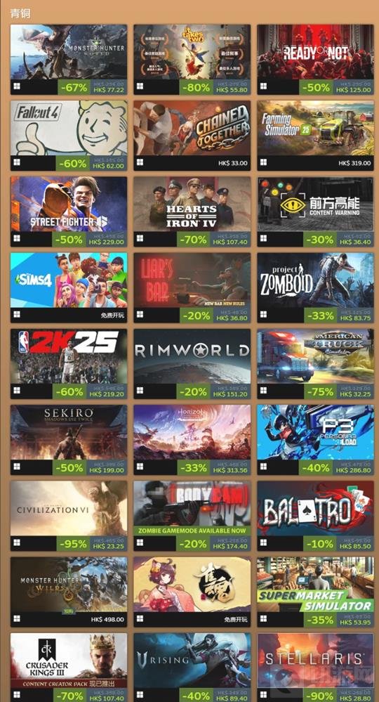 这个榜单包括了2024年Steam上收入最高的100款游戏,收入计算包括了游戏销售额、游戏内交易和DLC销售额。V社并没有公开具体收入数字,而是将游戏按照收入水平分为铂金、黄金、白银和青铜四个等级,每个等级内的游戏随机排序。