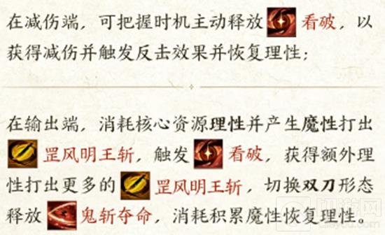 输出与资源管理:玩家消耗核心资源理性来释放“罡风明王斩”,同时触发“看破”以获得额外理性,从而释放更多的“罡风明王斩”。在双刀形态下,玩家可以通过释放“鬼斩夺命”技能来消耗积累的魔性并恢复理性。