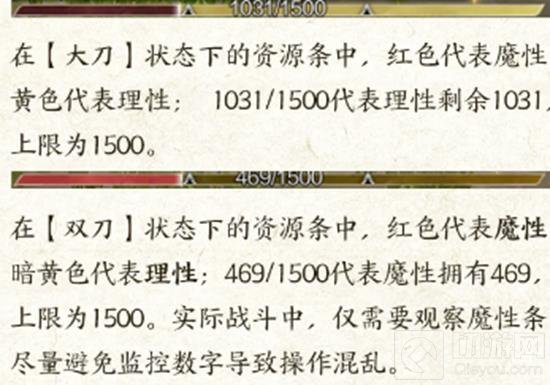 双刀状态下的资源条:红色条代表魔性,暗黄色条代表理性。例如,“469/1500”表示魔性值为469,上限为1500。在实际战斗中,玩家主要需要关注魔性条,以避免因监控数字而造成操作混乱。