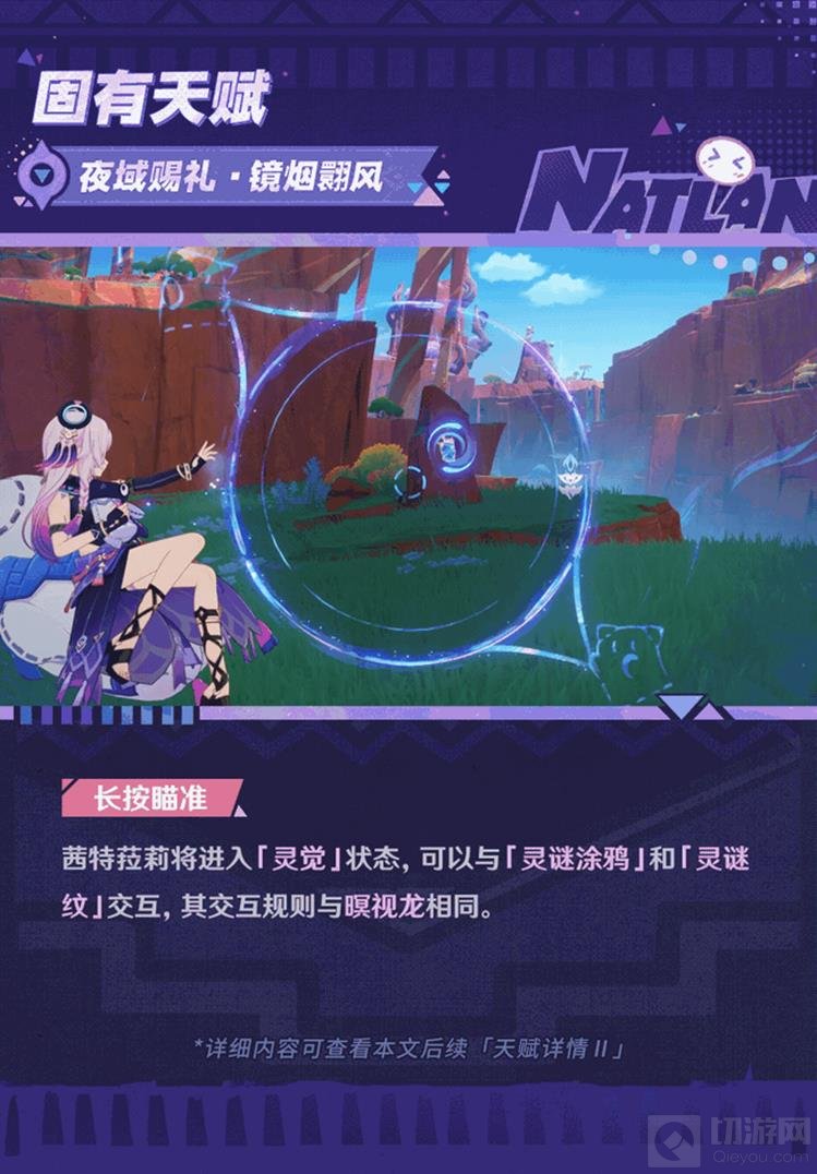 夜域赐礼·镜烟翾(xuan)风:在纳塔燃素机制区域内,长按跳跃消耗体力或燃素腾跃而起;切换出场时可借助伊兹帕帕飘行。长按瞄准进入「灵觉」状态,可以与特定的交互对象互动。