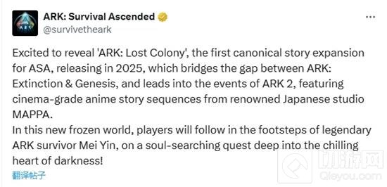 《方舟:失落之地》是《方舟:生存飞升》的主线故事扩展包,预计将在2025年发布。这个扩展包将填补《方舟:灭绝》DLC和《方舟:创世纪》DLC之间的空白,并为即将到来的《方舟2》做铺垫。扩展包中将包含由日本著名工作室MAPPA制作的影院级动画故事内容。