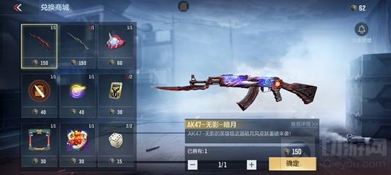 在烟火币商城里,我们可以兑换到的道具有两款武器皮肤AK47-无影-暗月皮肤和98K-黑骑士-星空皮肤,以及头饰、万化、按键和角色洗练券,除此之外还有王者之骰*2和Grenade互动卡。