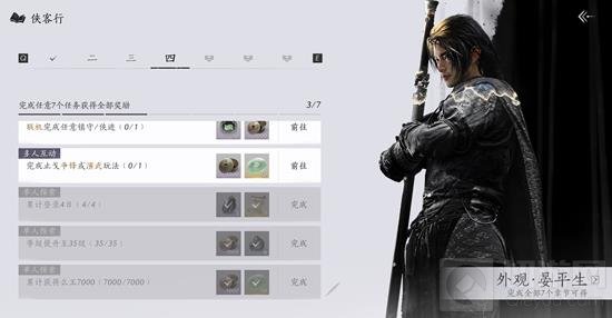 侠客行中一共分为七个章节,每个章节都有不同的活动任务,我们需要点击对应章节,完成每个章节的活动。完成后,即可获得时装全套。