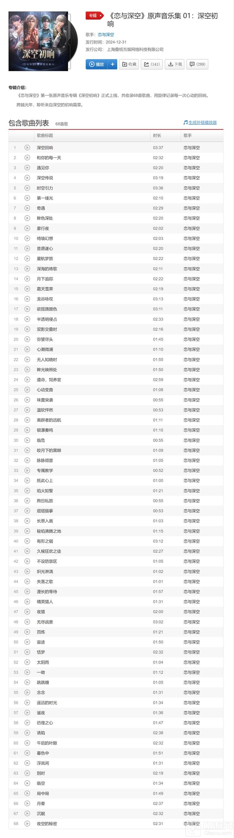 《恋与深空》3.0年度版本「万象遇你」已经正式上线,为玩家带来了全新的游戏体验。与此同时,游戏的原声音乐集01「深空初响」也在网易云音乐、QQ音乐、酷狗音乐和酷我音乐等各大音乐平台同步发布,让玩家在游戏之外也能享受到游戏音乐的魅力。
