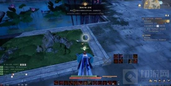 3、飞到荷花池塘边上,在小花坛里面找到灵体。