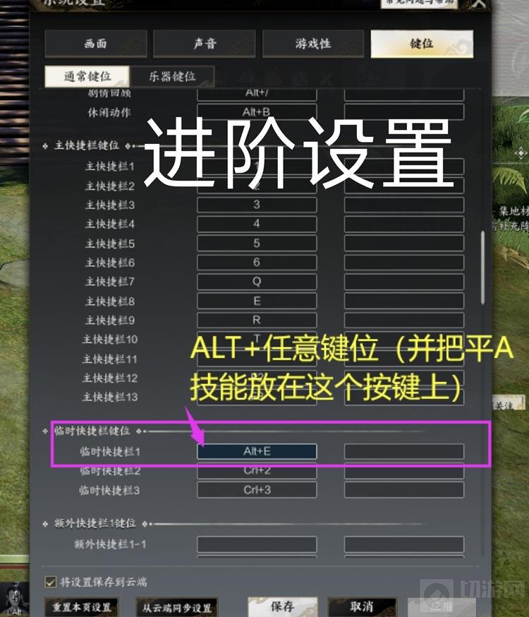 在键位设置中,将“通常键位”的“临时热键栏1”改为Alt+任意按键。