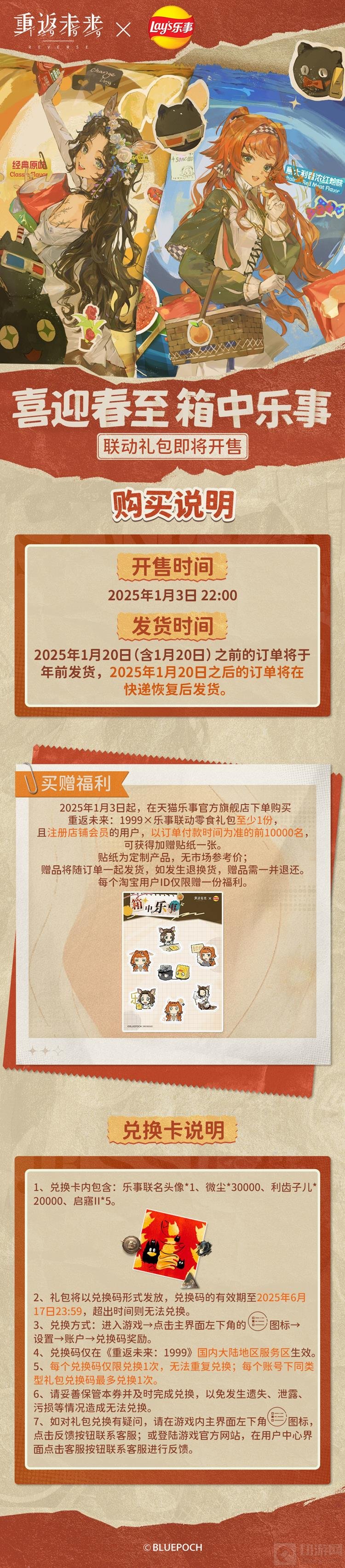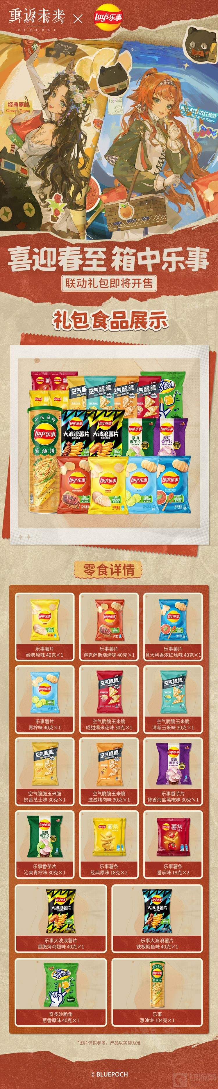 重返未来1999和乐事薯片的联名活动正式开启了。即日起购买礼包,即可获得包含游戏周边在内的薯片礼包。具体详情如下。