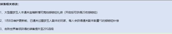 噩梦五人副本补偿:对于在1月8日维护更新前已通关过噩梦五人副本的玩家,将获得通关副本数量乘以5的蜉蝣珀补偿。例如,若玩家之前通关了3次噩梦五人副本,则可获得15枚蜉蝣珀补偿,这一补偿措施体现了游戏对老玩家的关怀和回馈.