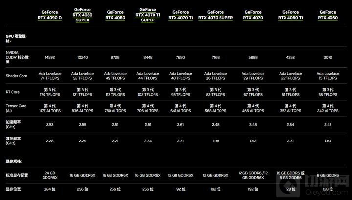 上代是Ada Lovelace架构,全系其实是比较省电的类型。具体的40系规格可以看下图,也方便和上表进行对比。