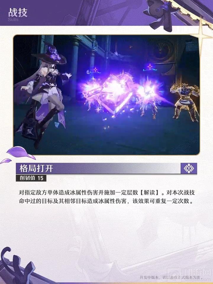 大黑塔的战技“格局打开”是她核心的输出技能之一。该技能对指定敌方单体造成70%攻击力的冰属性伤害,并施加1层【解读】标记。随后,技能会扩散至目标及其相邻单位,造成两次70%攻击力的冰属性伤害。这一技能不仅能够对多个目标造成伤害,还能通过【解读】标记为后续输出提供增益。每次使用战技可恢复30点能量,并在弱点击破方面表现出色,单攻和扩散分别可造成15点和10点弱点击破值。