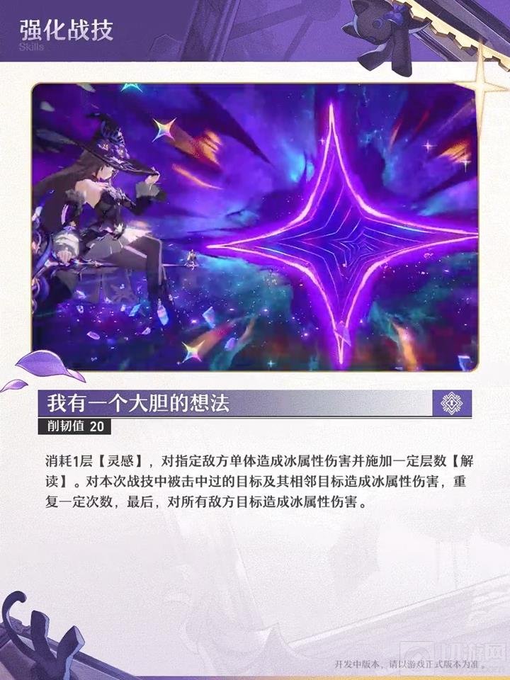 当大黑塔持有【灵感】时,她的战技会进化为“我有一个大胆的想法”。这一技能消耗1层【灵感】,对指定敌方单体造成80%攻击力的冰属性伤害并施加1层【解读】。随后,技能会扩散至目标及其相邻单位,造成两次80%攻击力的冰属性伤害,最后对所有敌方目标造成40%攻击力的冰属性伤害。强化战技的伤害倍率更高,且覆盖范围更广,适合在终结技后快速清理战场。