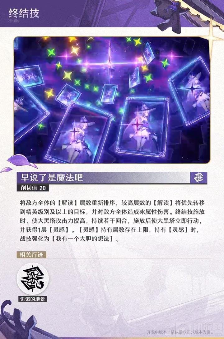 大黑塔的终结技“早说了是魔法吧”是一个强力的群体输出技能。该技能会重新排序敌方全体的【解读】层数,优先将高层数【解读】转移至精英级别及以上的目标,随后对全体敌人造成200%攻击力的冰属性伤害。施放终结技后,大黑塔的攻击力提升80%,持续3回合,并立即获得一次行动机会和1层【灵感】。【灵感】可强化她的战技,使其进化为“我有一个大胆的想法”。终结技的能量消耗较高,但收益显著,尤其是在面对多个精英敌人时,能够迅速扭转战局。