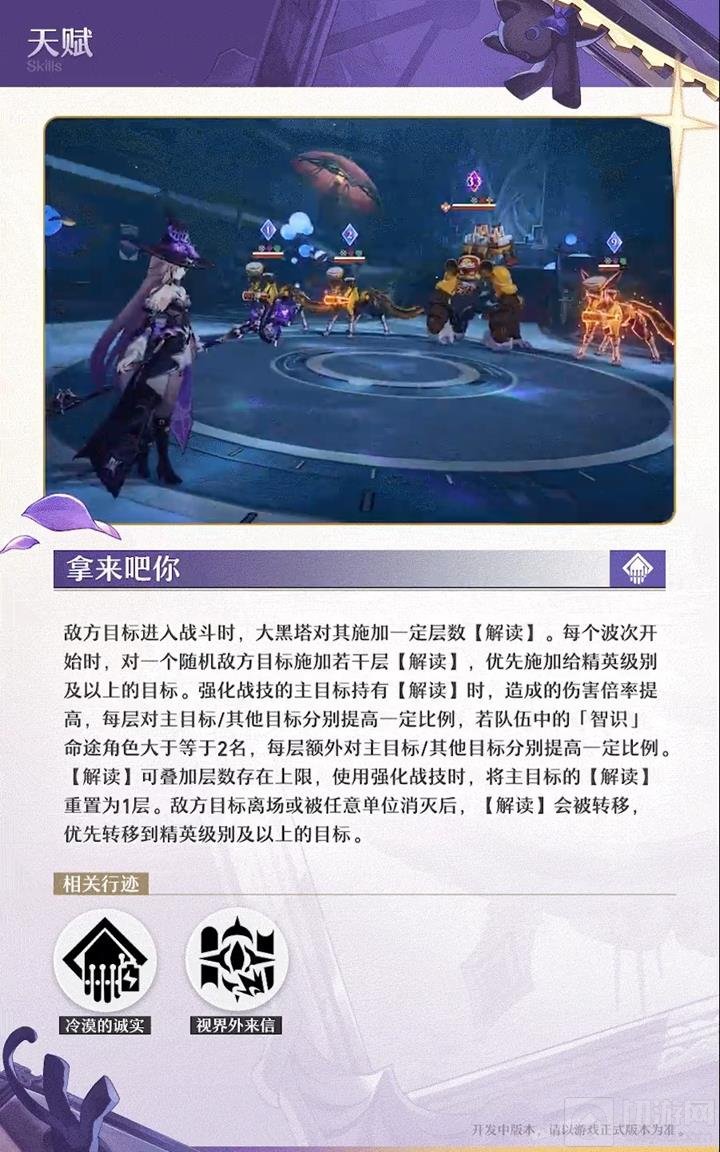 冷漠的诚实:我方目标攻击时,对被击中的敌方目标施加1层【解读】。攻击后,本次攻击每击中1个目标就使大黑塔固定恢复3点能量,最多计算5个目标。施放强化战技时,若主目标的【解读】层数为42,大黑塔造成的伤害提高50%,持续到本次攻击结束。这一能力不仅提升了能量恢复效率,还大幅增强了她的爆发输出。