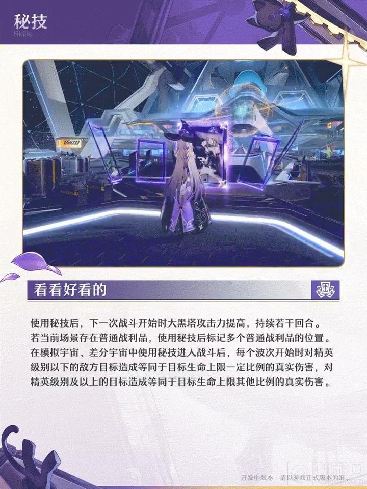大黑塔的秘技“看看好看的”在探索和战斗中都有重要作用。使用后,下一次战斗开始时,她的攻击力提升60%,持续2回合。此外,秘技还能在当前场景中标记最多3个普通战利品的位置,为队伍提供额外资源。在模拟宇宙和差分宇宙中,秘技进入战斗后,每个波次开始时会对精英级别以下的敌人造成99%生命上限的真实伤害,对精英级别及以上的敌人造成30%生命上限的真实伤害。这一技能极大地提升了她在高难度副本中的实用性。