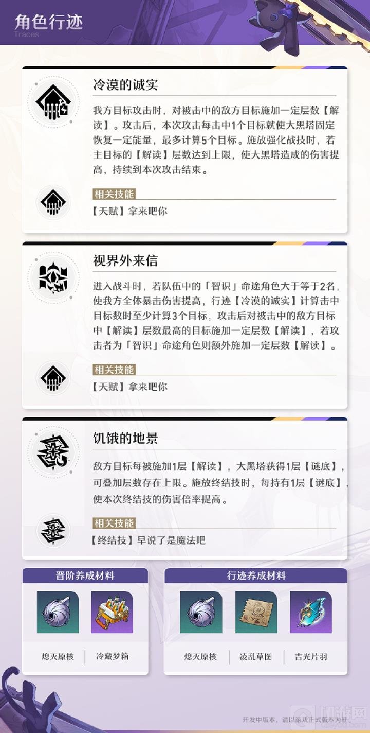 饥饿的地景:敌方目标每被施加1层【解读】,大黑塔获得1层【谜底】,最多叠加99层。施放终结技时,每持有1层【谜底】,终结技的伤害倍率提高1%。这一能力进一步提升了她的终结技输出,尤其在长时间战斗中收益显著。