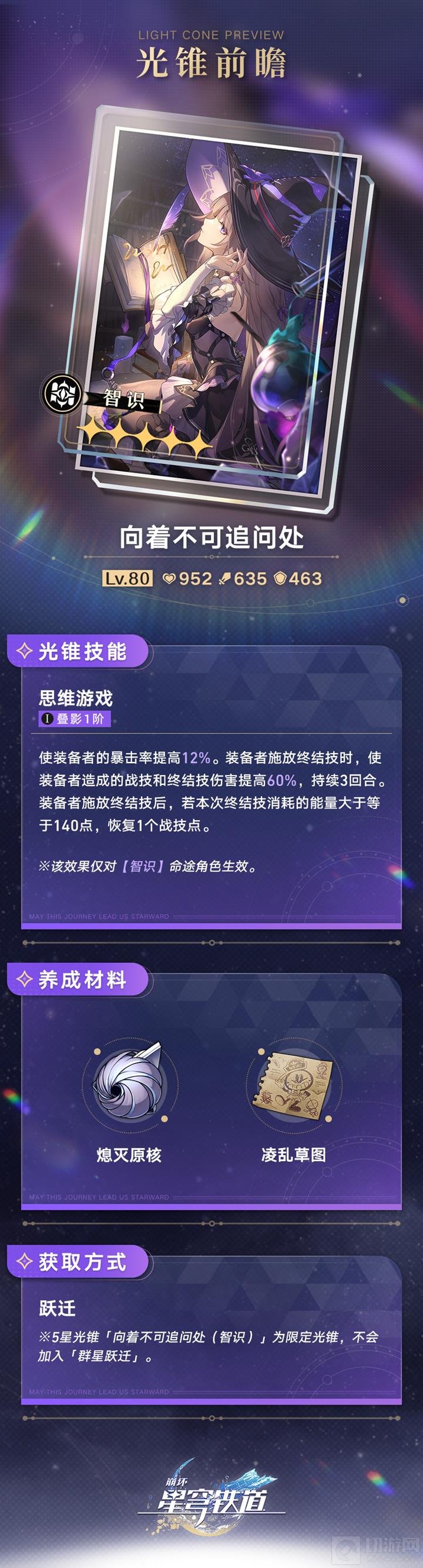 「向着不可追问处」是一件5星限定光锥,属于「智识」命途专属装备。在满级(Lv.80)时,其基础属性为: