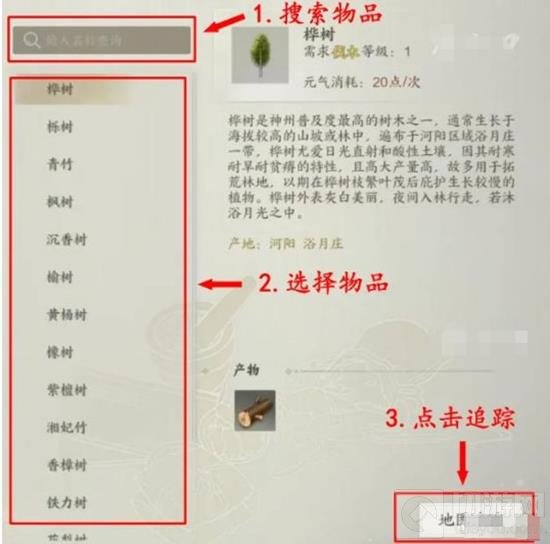 1.选择你要制作的物品,下方会提示你所需材料,在材料的:采集、挖矿、伐木处搜索你的物品,选择追踪,地图即点亮提示你要去的范围,到达区域后操作即可