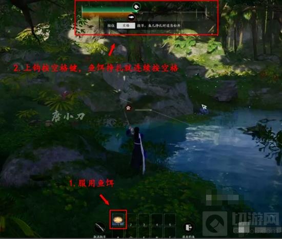 1.我们可以在河阳城放大地图,找到材料商人购买鱼竿和鱼饵(也可以自己制作一个鱼竿,品质越高钓鱼效率越好)
