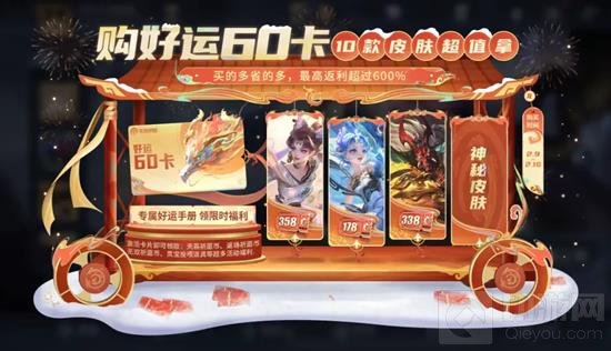 优惠券领取与使用:开通好运60卡后,可以领取春节期间新皮肤的优惠券,购买传说皮肤可抵扣358点券,购买史诗皮肤可抵扣178点券.以今年的年限皮肤为例,假设是6款皮肤,三款传说三款史诗,没有好运60卡的情况下全部购买需要6420点券,而开通好运60卡后,只需要4800点券左右,再加上好运60卡的600点券,总共只需5400点券.