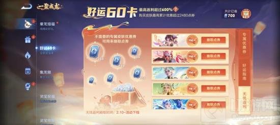 优惠券兑换点券:好运60卡开通后,除了年限皮肤的优惠券,后续的皮肤也会有优惠券,如果这些优惠券不用的话,可以兑换成点券,按照惯例,即便是一款皮肤不买,全部兑换成点券,最少也有600点券.