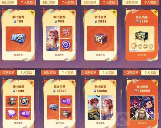 活动机制:春节期间会上线点券消费活动,分为个人消费和组队消费.组队消费是指玩家加入一个队伍,队伍消费的点券达到一定数额后,就可以领取永久皮肤以及荣耀积分或者积分夺宝抵用券等等奖励.