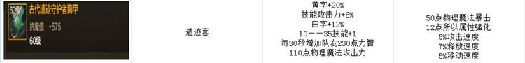 遗迹套在55版本中是战术套,到了65版本则成为了板甲套,堪称版本T0辅助套。修罗职业的辅助能力与遗迹套的属性相得益彰,使得“3遗迹套”修罗在世界中大放异彩。遗迹套的属性均衡,重点在于辅助能力,因此搭配这套装备时,武器直接选择毕业武器破碎即可。如果队友也穿着遗迹套,辅助装备则可以选择斗者,配合遗迹套的光环效果,能够发挥出更强的辅助作用。
