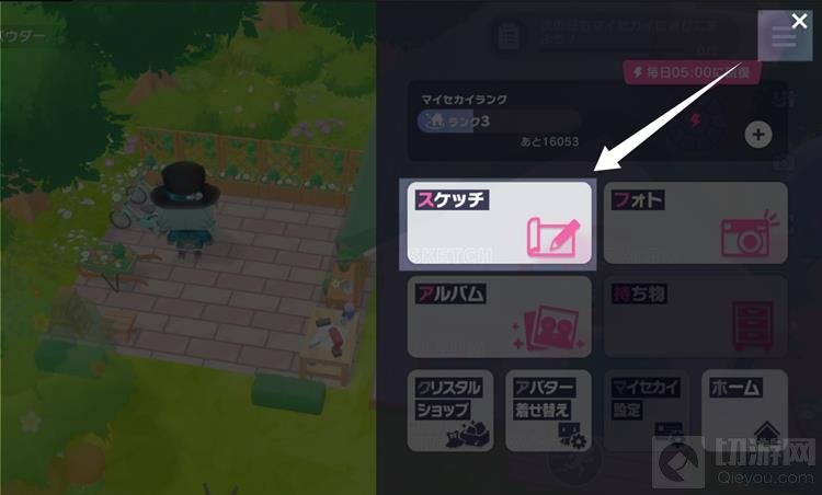 3. 我们来到其他的小世界之后,可以寻找一下有什么家具设施自己没有解锁过图纸,来到跟前。然后打开右上角菜单并点击“摹写(スケッチ)”按钮,这时会进入摹写设计图状态。