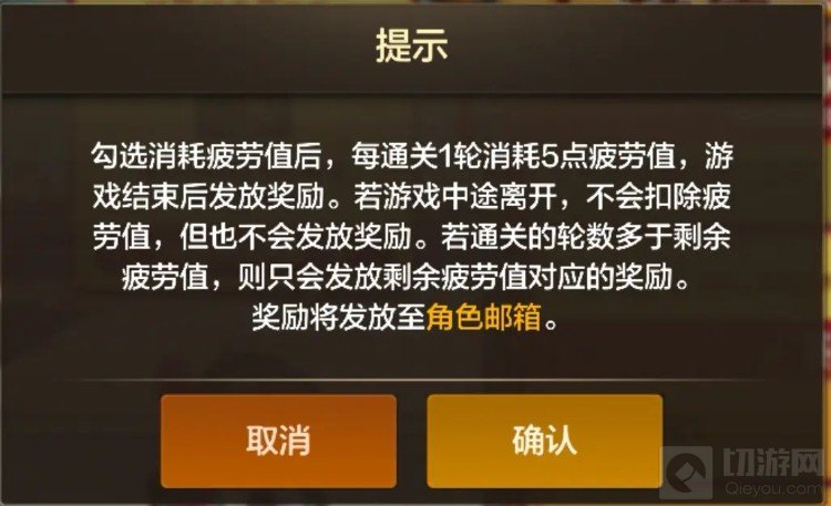 关卡一共20关,全部通关以后扣除疲劳,并发放疲劳币,中途退出不消耗疲劳,但也无法获得疲劳币奖励。