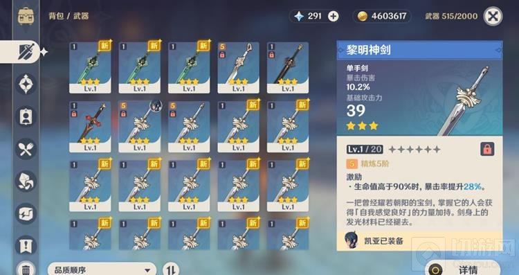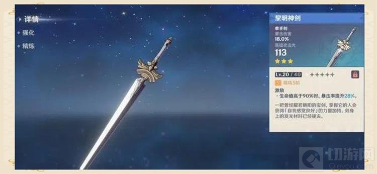 最后是黎明神剑,这款被誉为“神剑”的武器,不仅名字寓意深远,更在游戏中展现出其独特的魅力。它能够有效地增强角色的爆伤能力,使其在战斗中更加强大。特别值得一提的是,当角色的生命值维持在90%及以上时,黎明神剑能进一步提升最高达28%的暴击率,这一特点让它在众多武器中独树一帜。作为唯一一把能同时增加双爆属性的单手剑,黎明神剑深受玩家们的喜爱与追捧,其地位由此可见一斑。